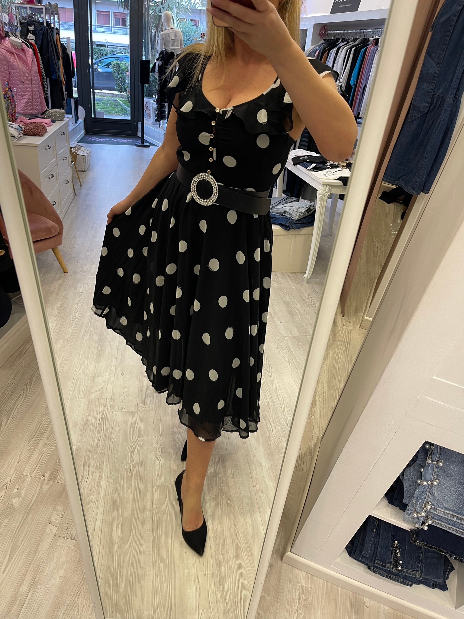 Abito linea diritta mini a pois, scollo a V con bottoncini, fondo svasato. e con maniche corte con gale.