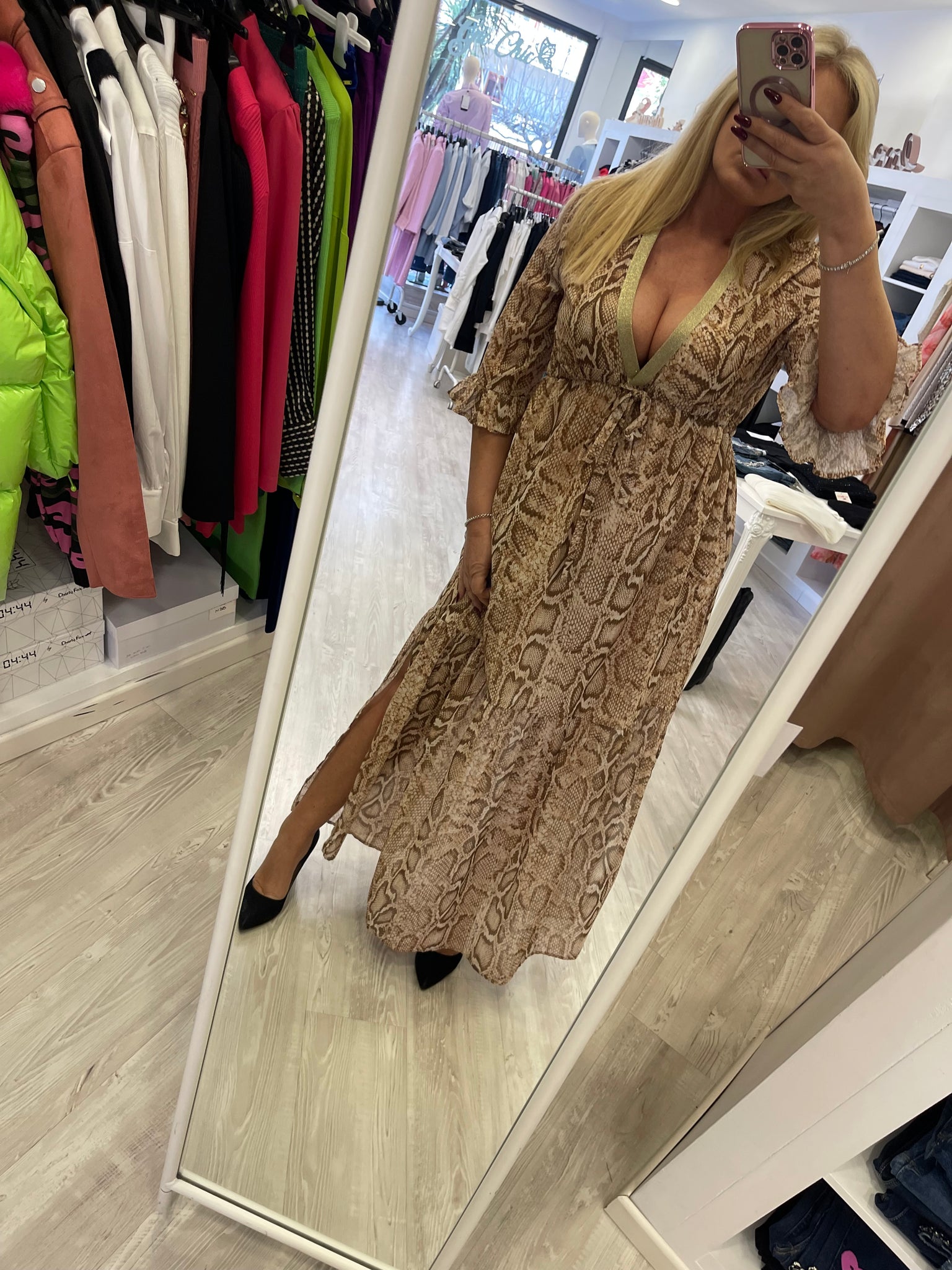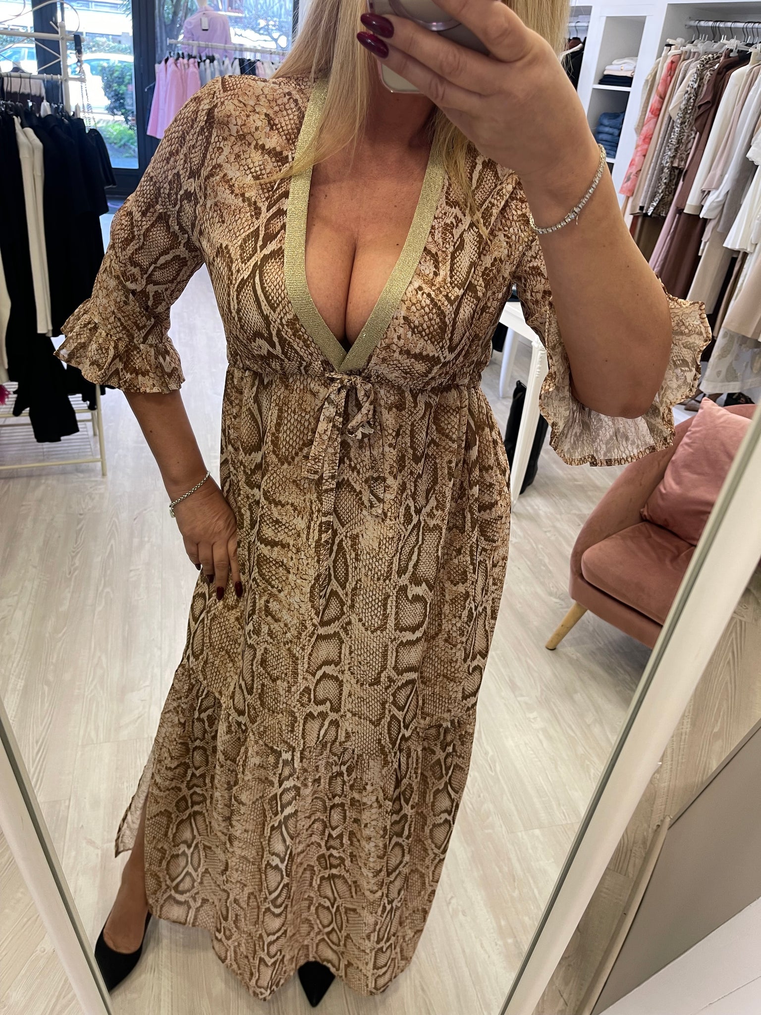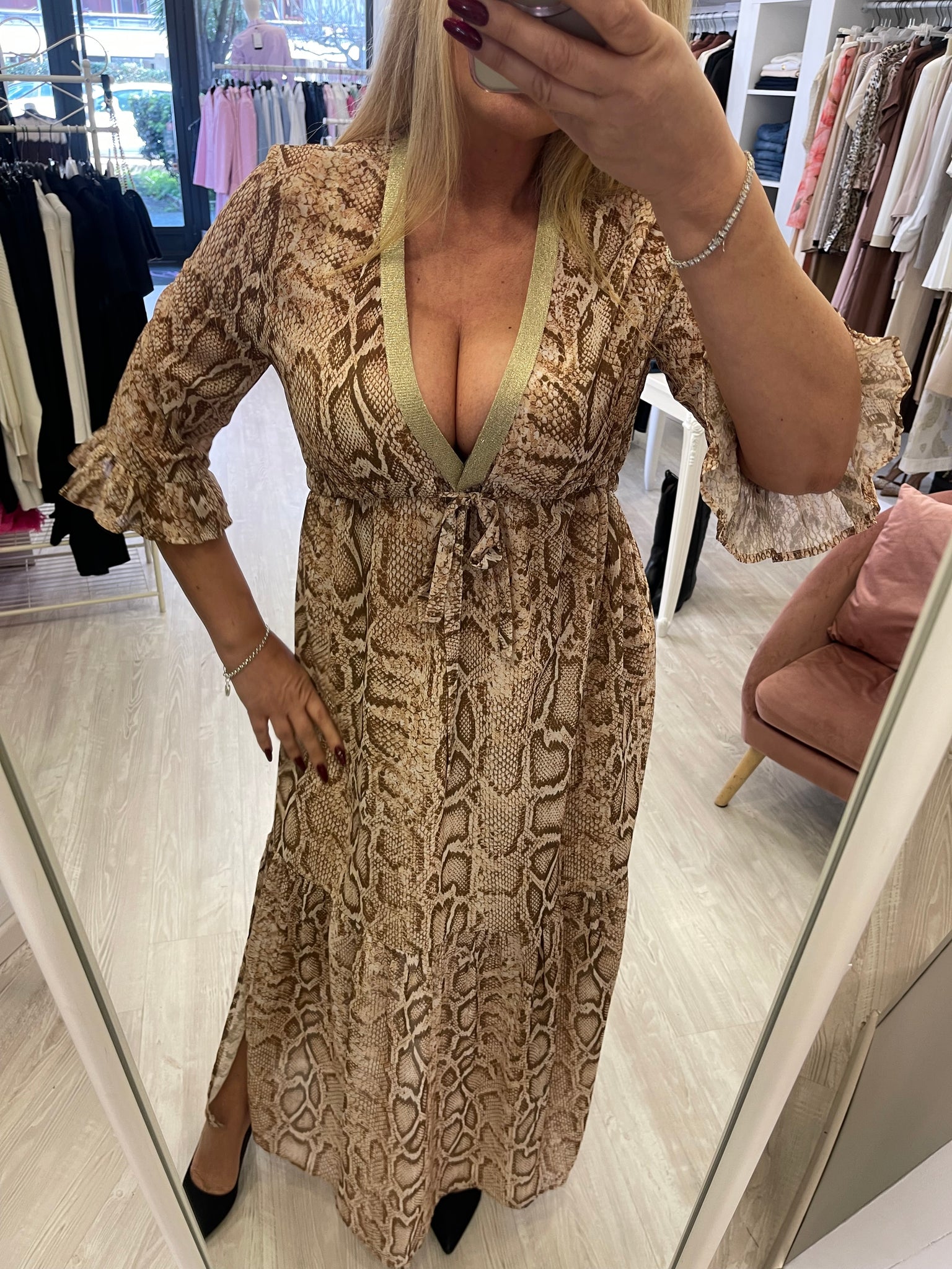 Abito lungo con spacchi laterali , scollo a V profilo lurex , cintura morbida per stringere o allargare la vita , maniche 3/4 . fodera interna .