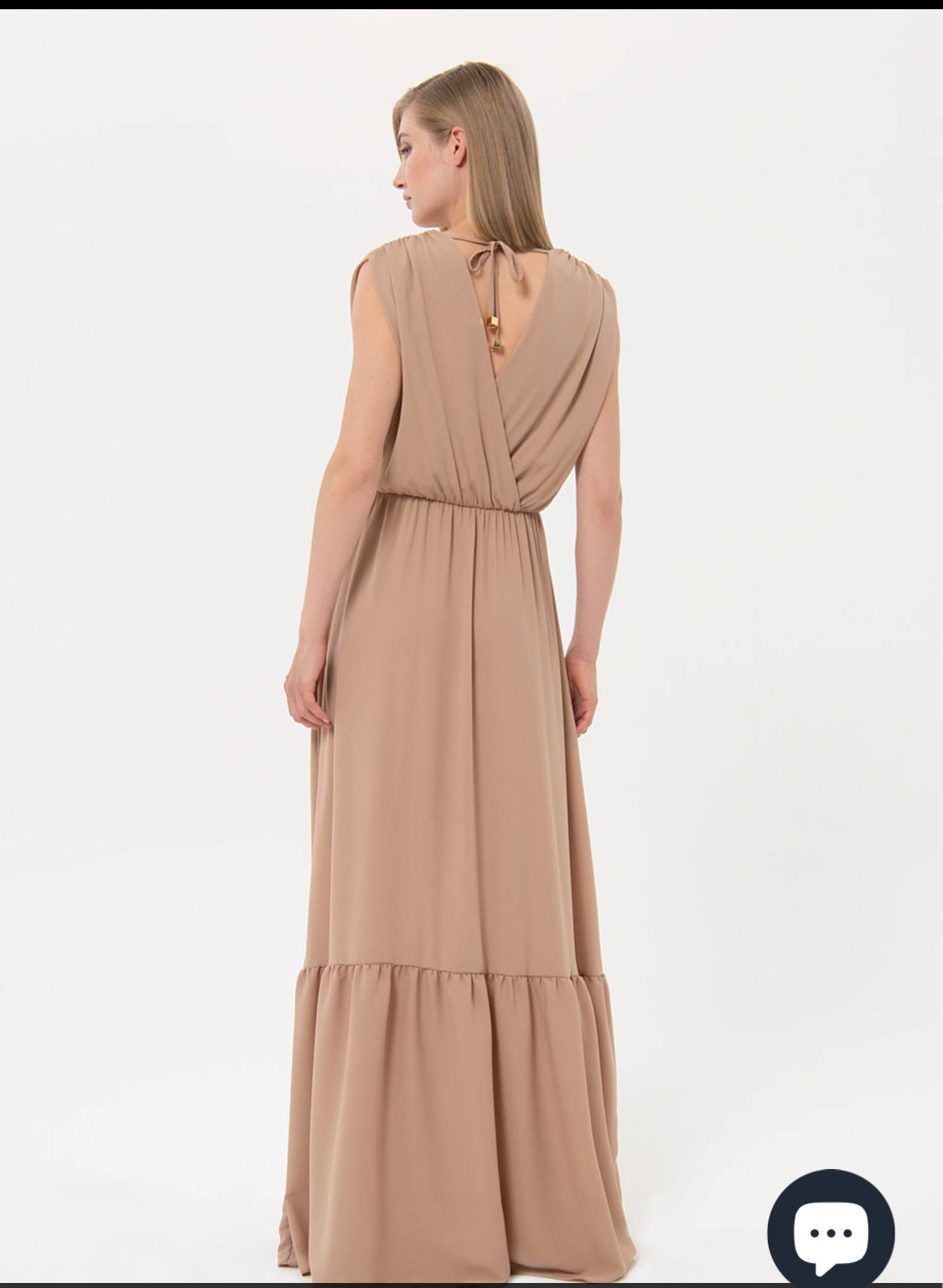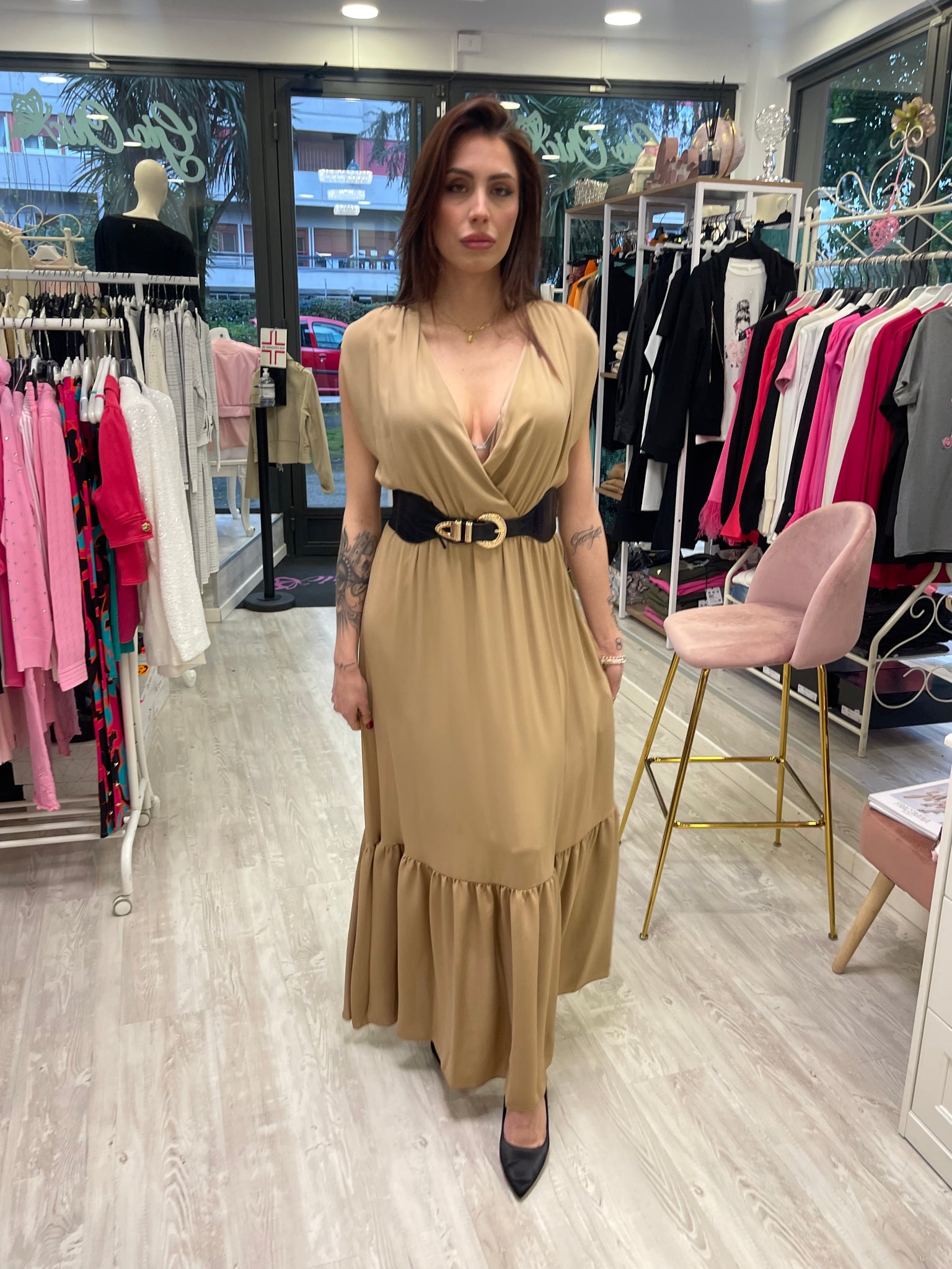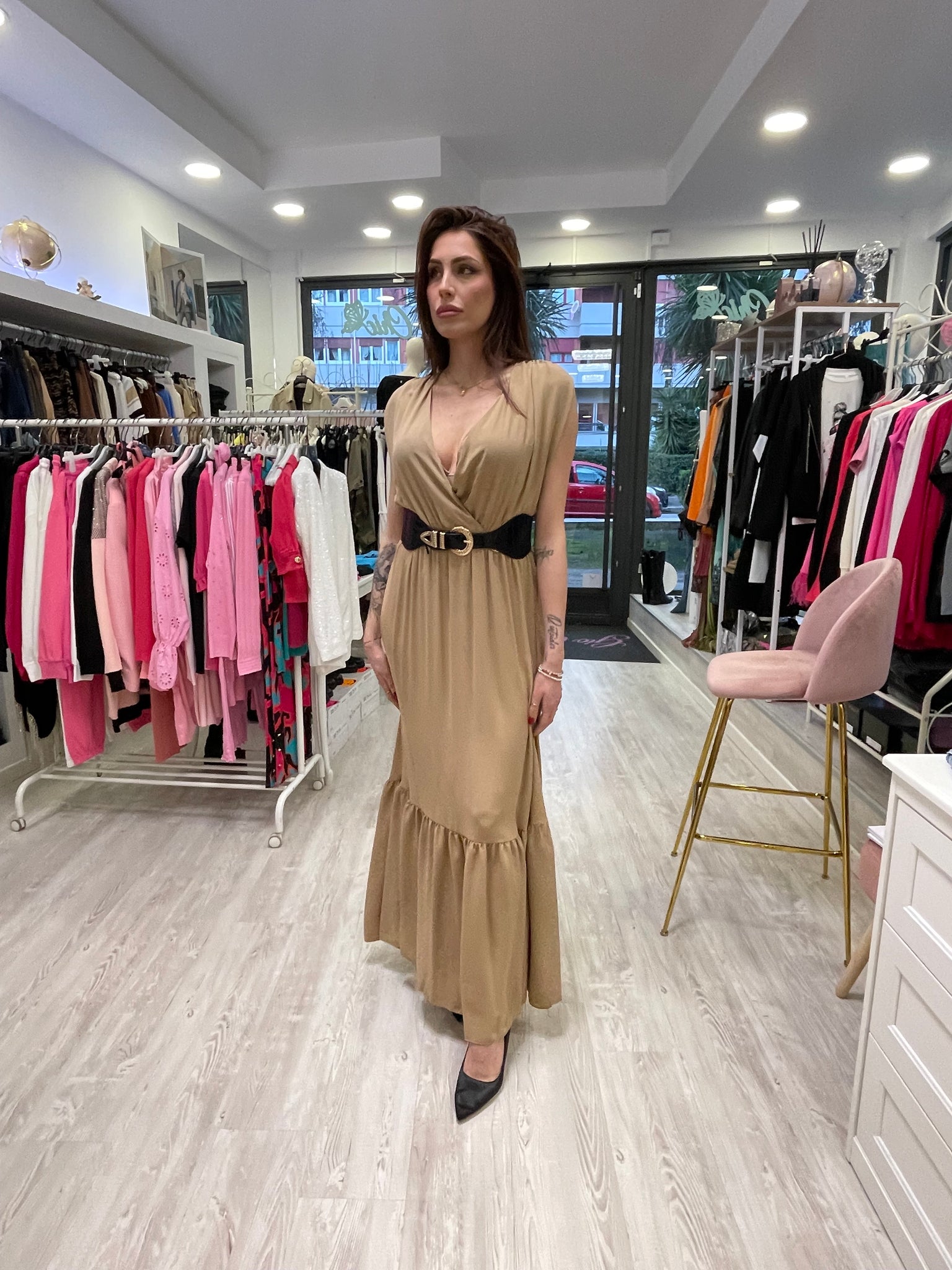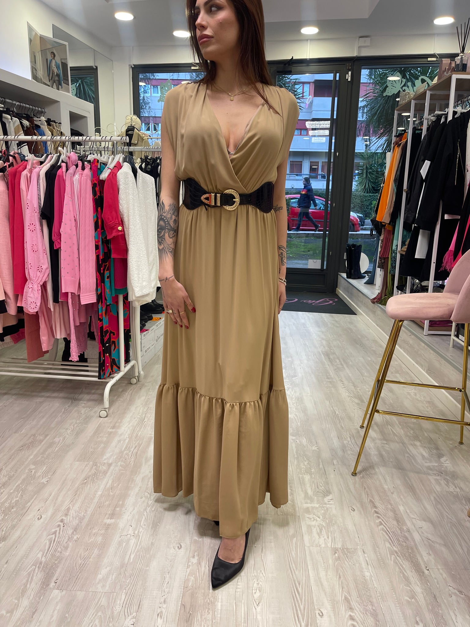 Abito senza maniche lungo, scollo ad incrocio, taglio in vita, gonna ampia, e con balza sul fondo.