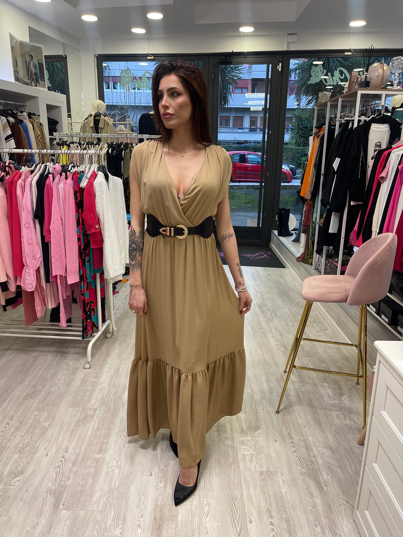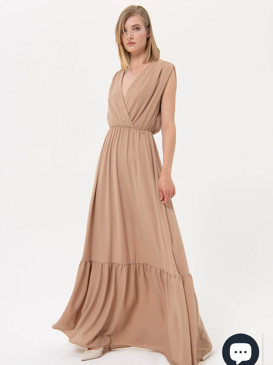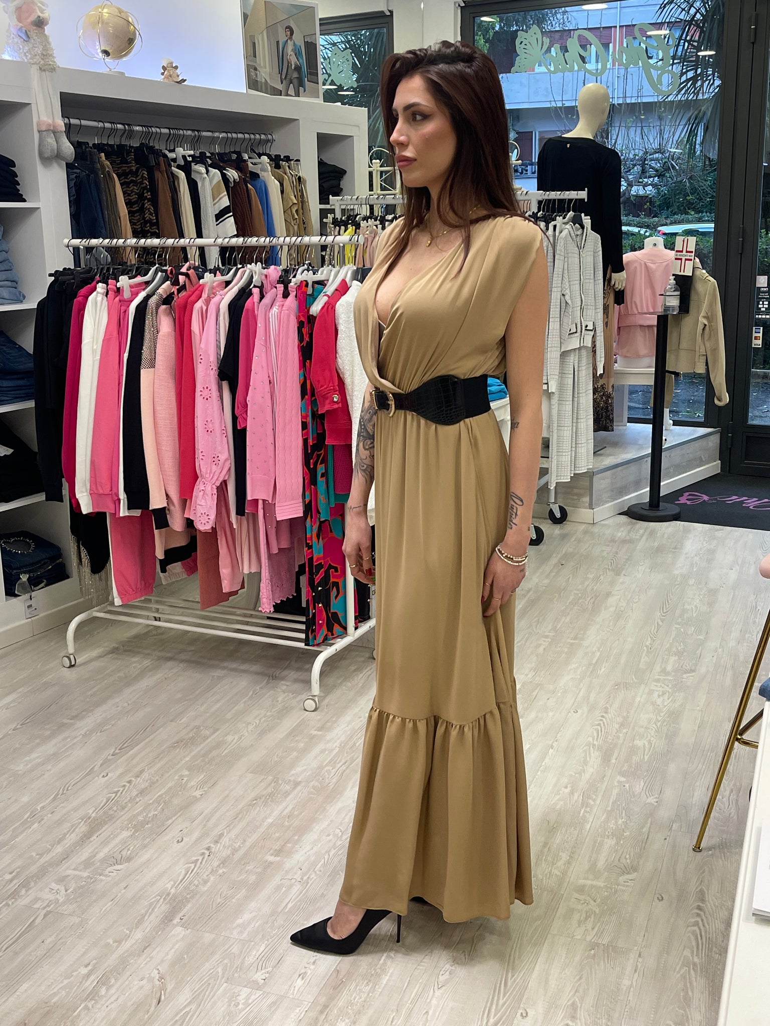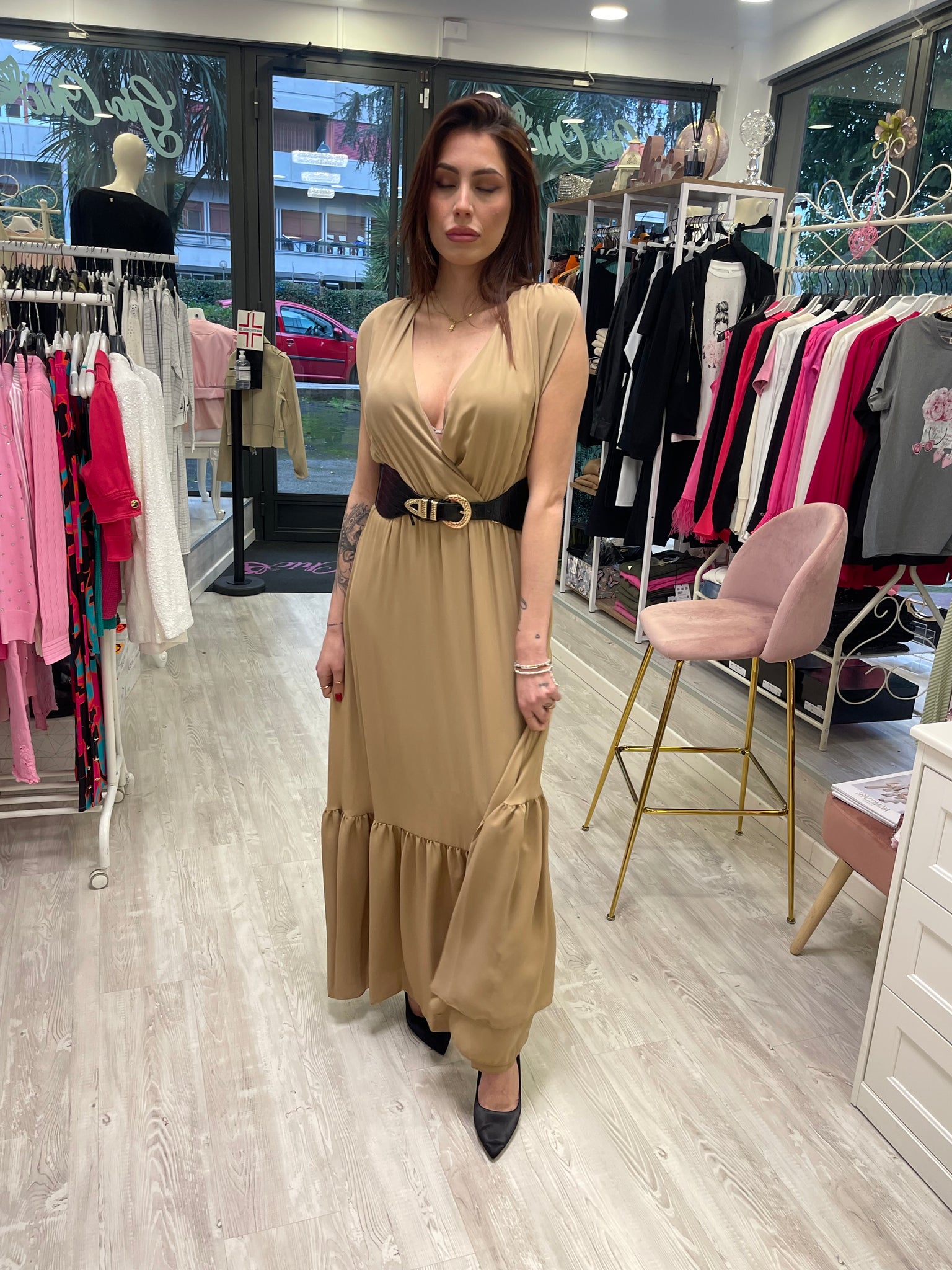 Abito senza maniche lungo, scollo ad incrocio, taglio in vita, gonna ampia, e con balza sul fondo.