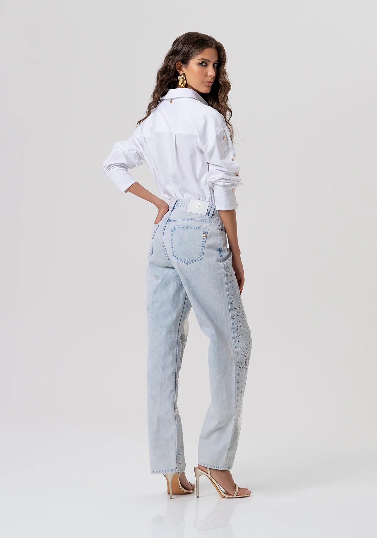 Jeans straight fit in denim con lavaggio chiaro e con trasparenze, vita regolare, e 5 tasche.
