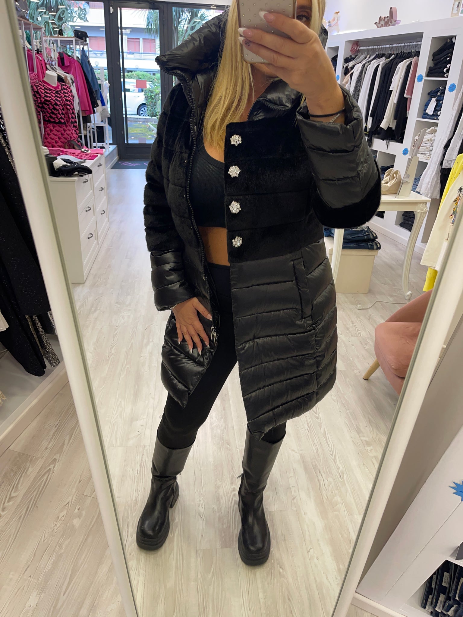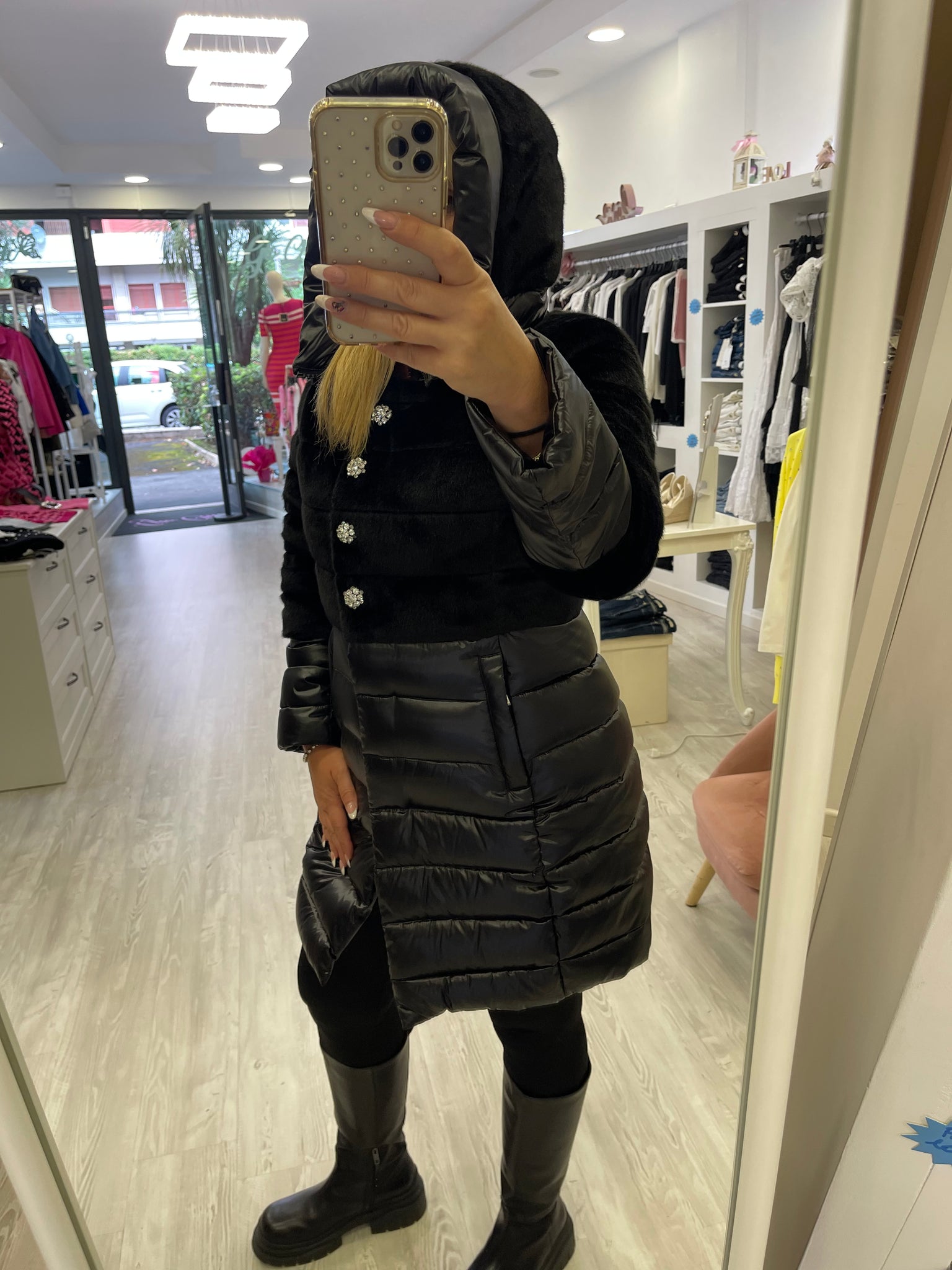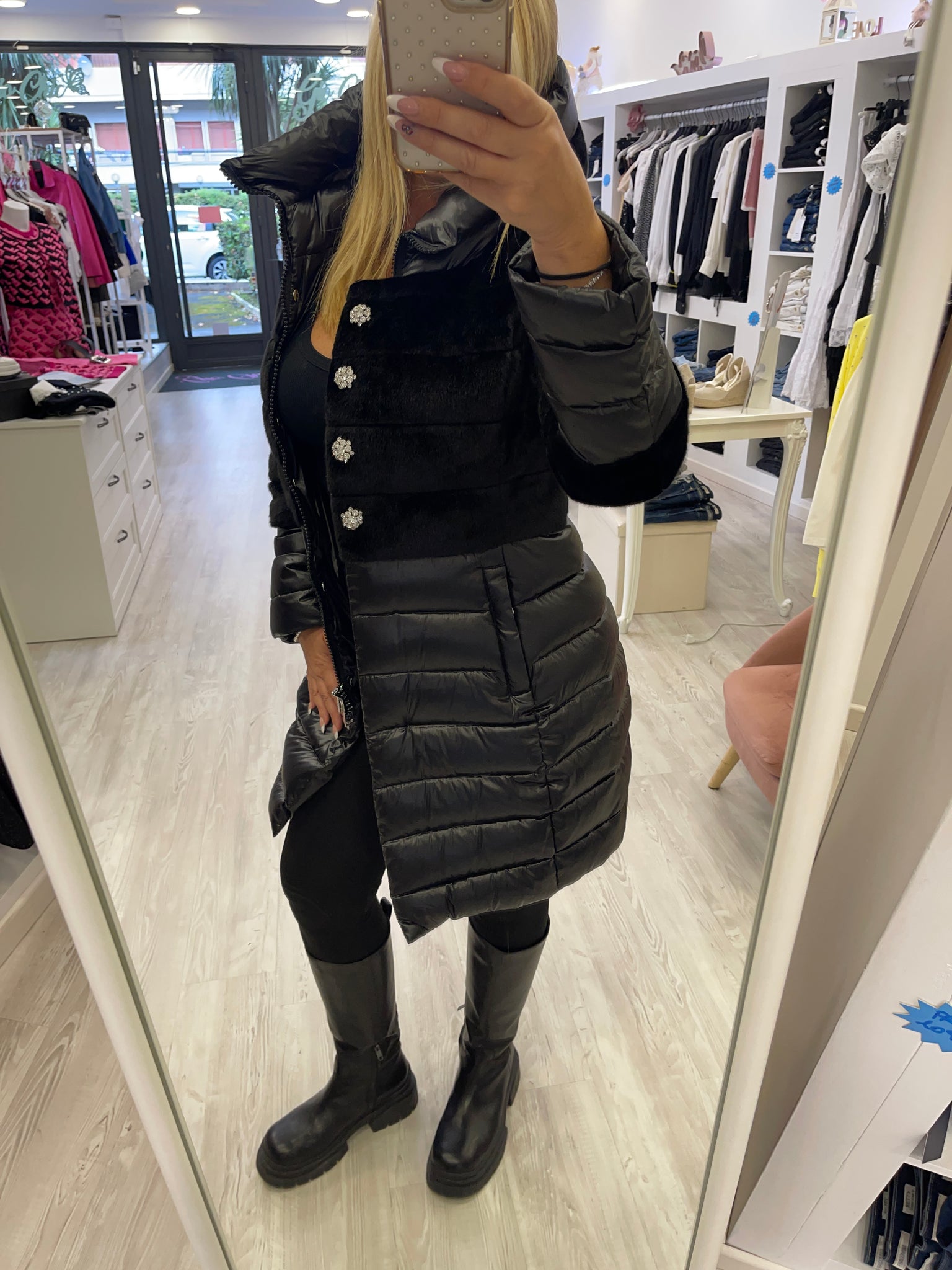 Piumino d’oca lungo con cappuccio e bottoni gioiello
