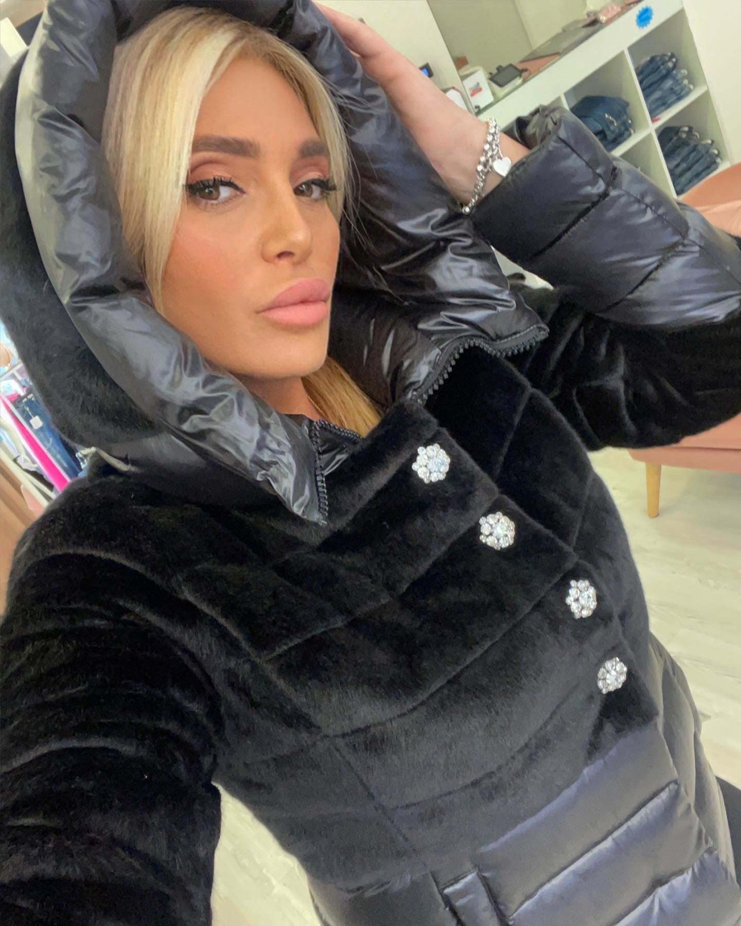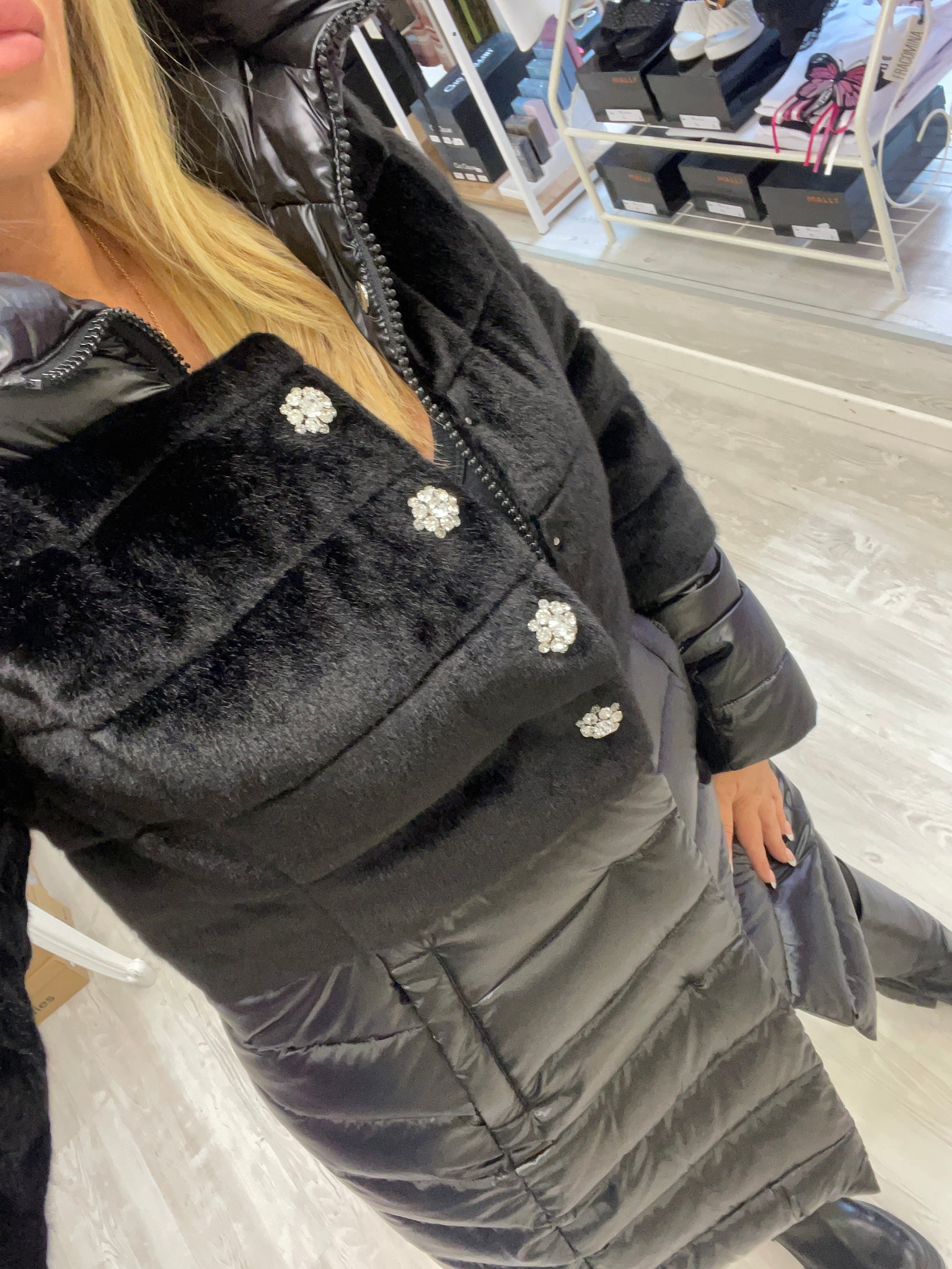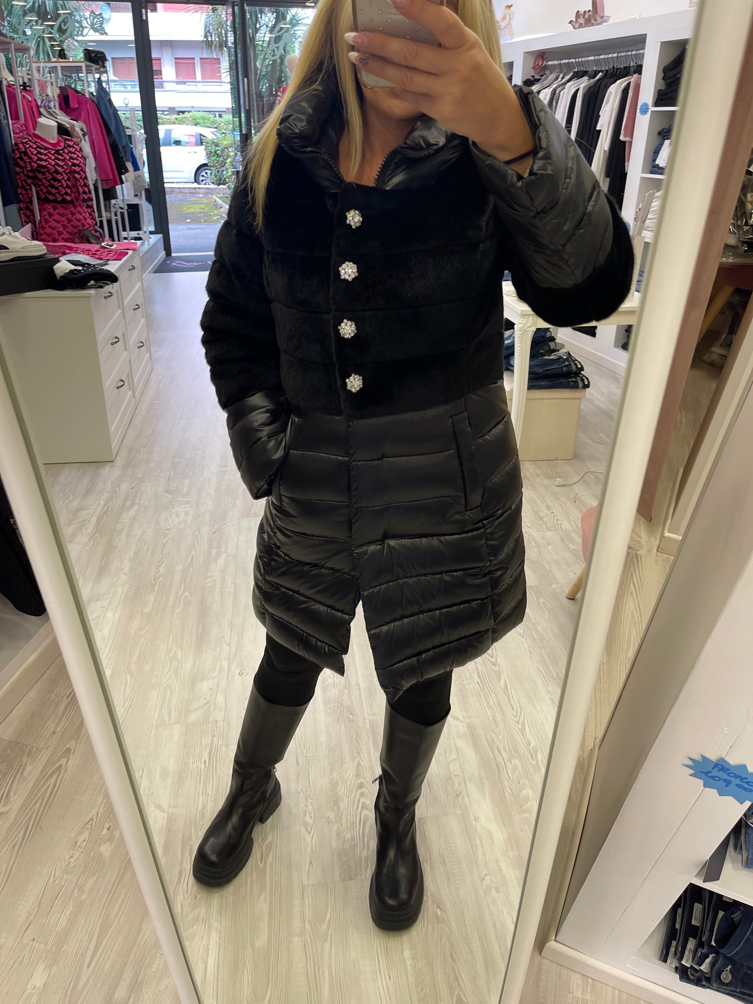 Piumino d’oca lungo con cappuccio e bottoni gioiello