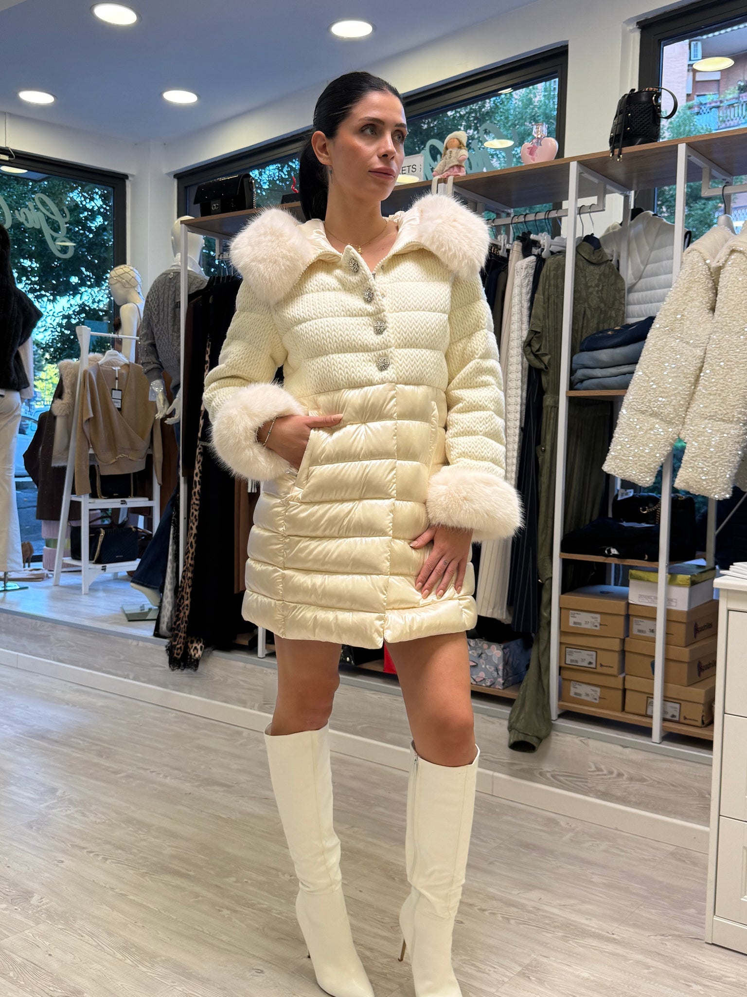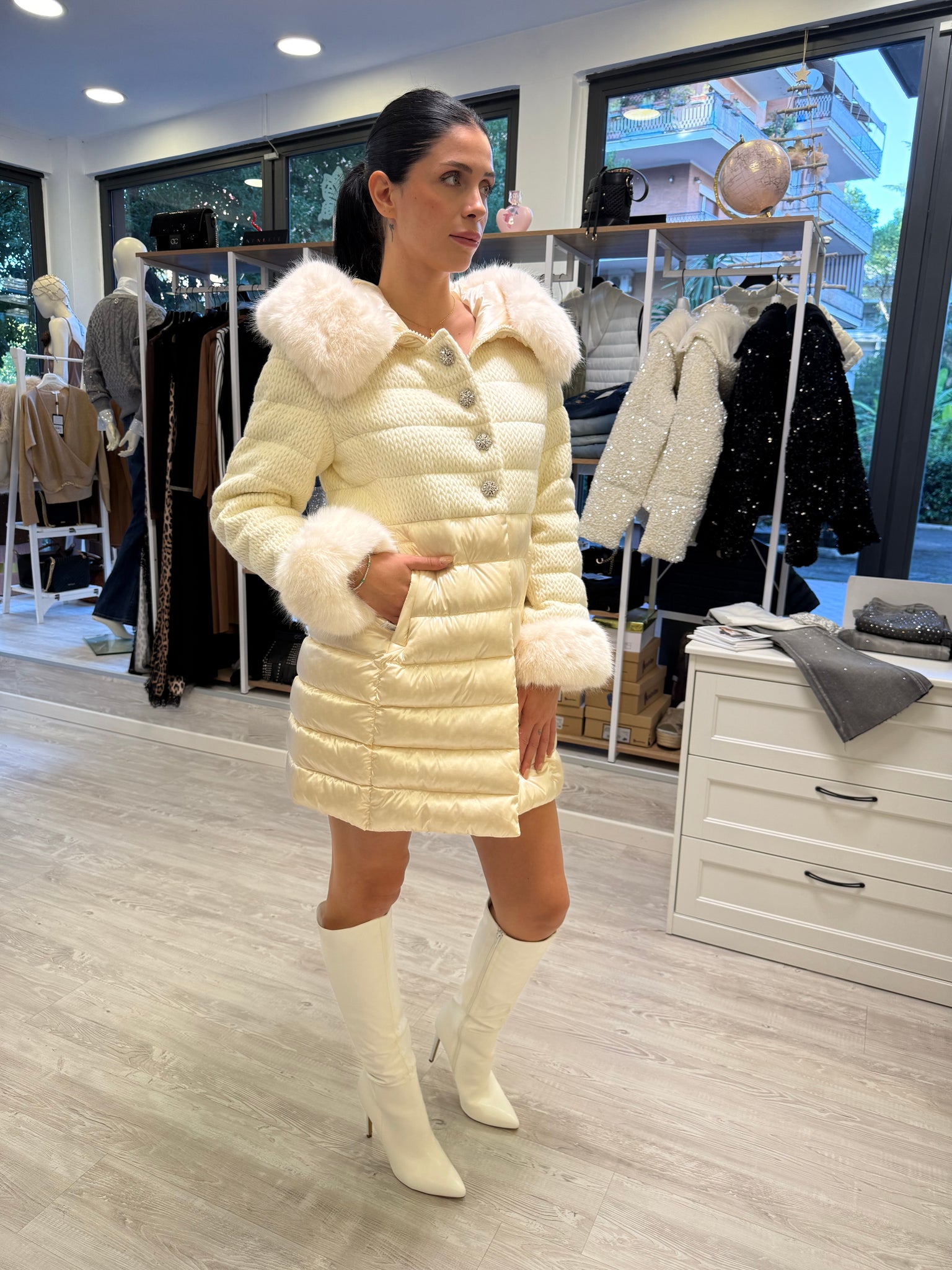 Piumino d’oca con bottoni gioiello e kit bottoni neri in dotazione .