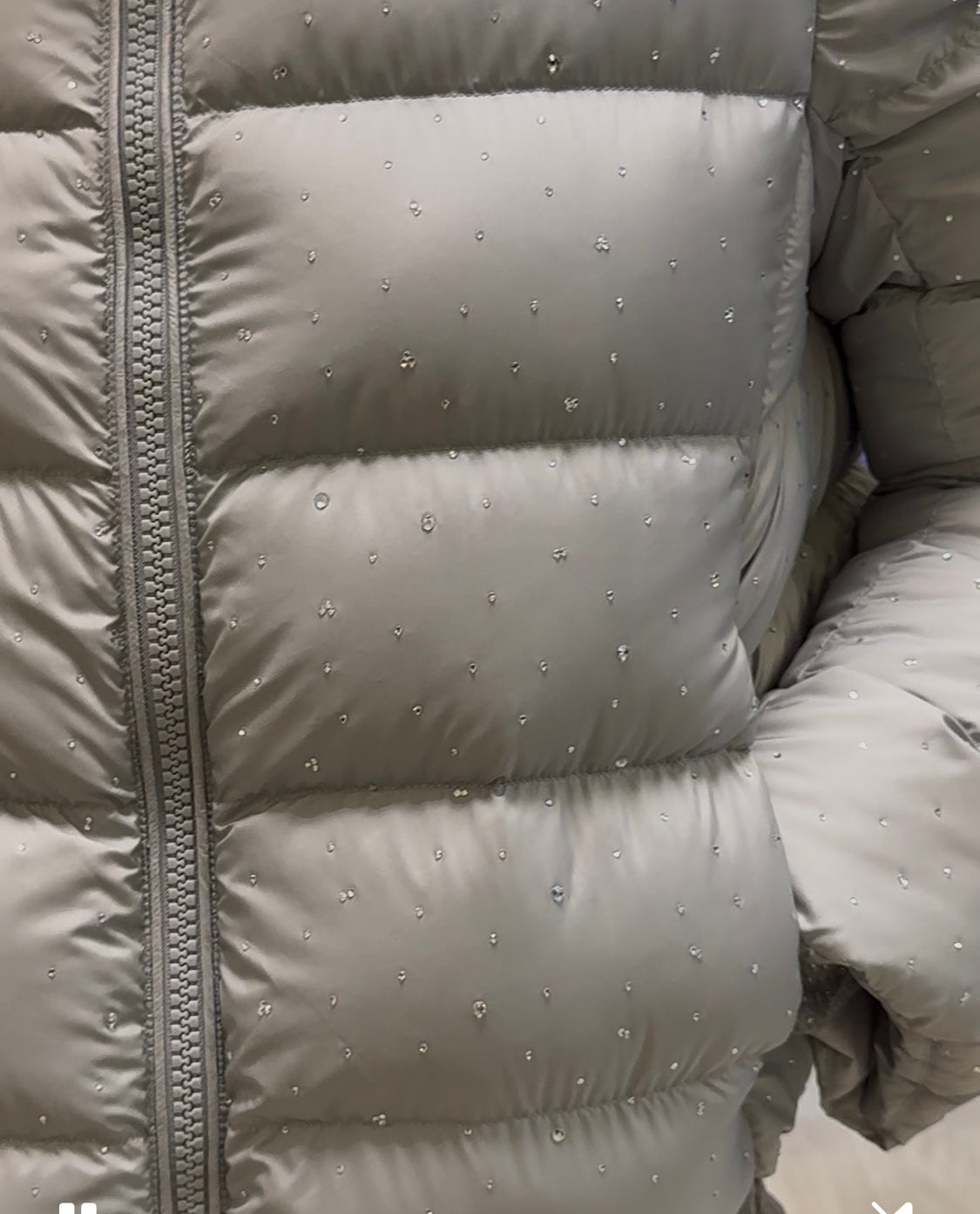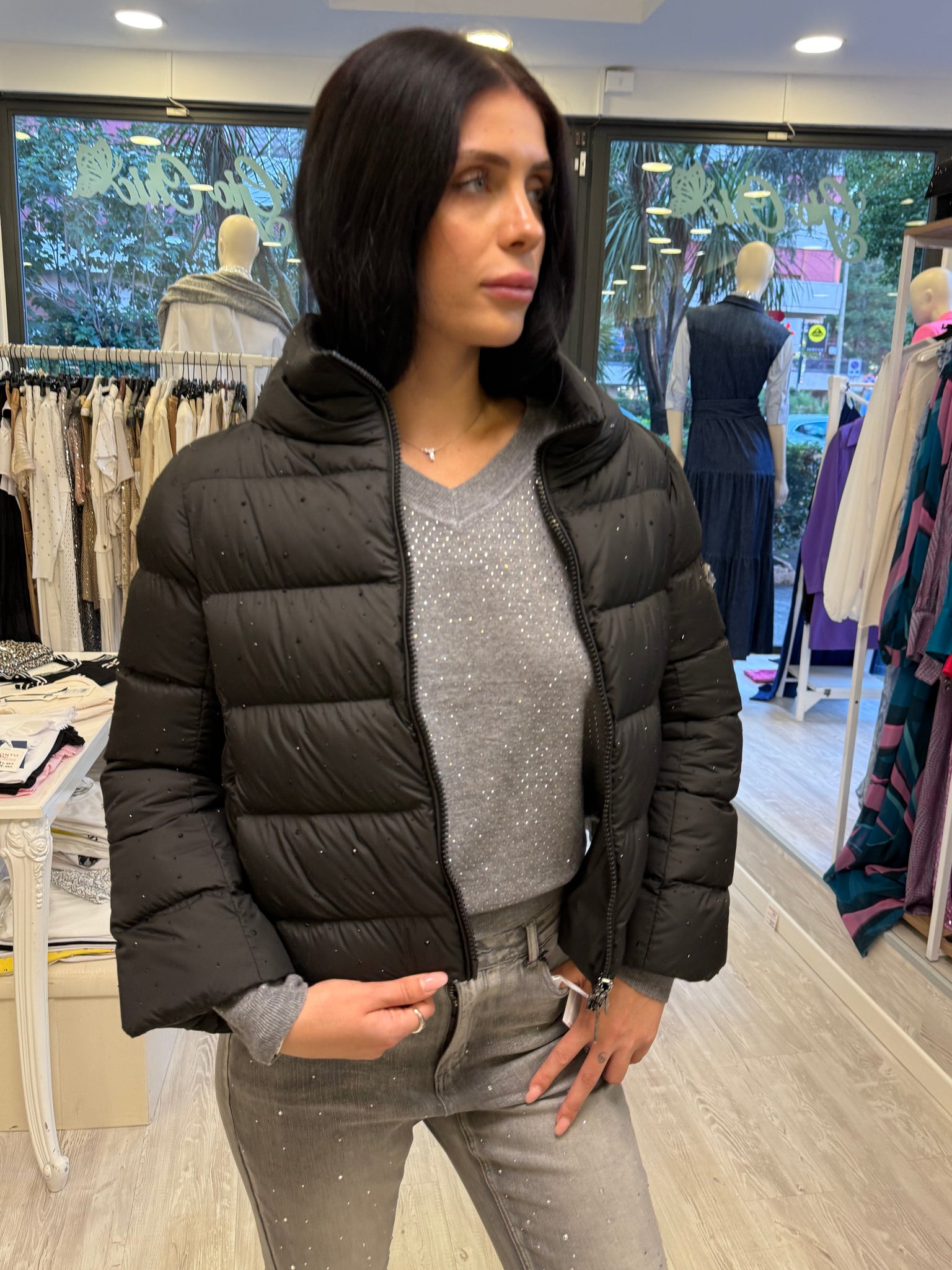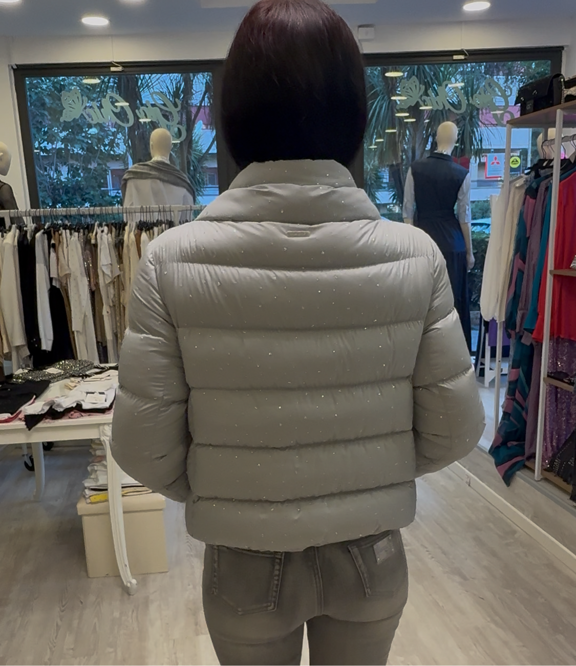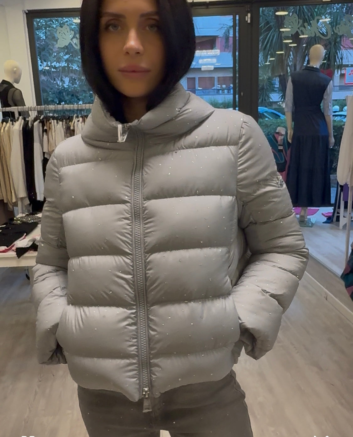 Piumino d’oca con manica a campanella chiusura centrale con zip .