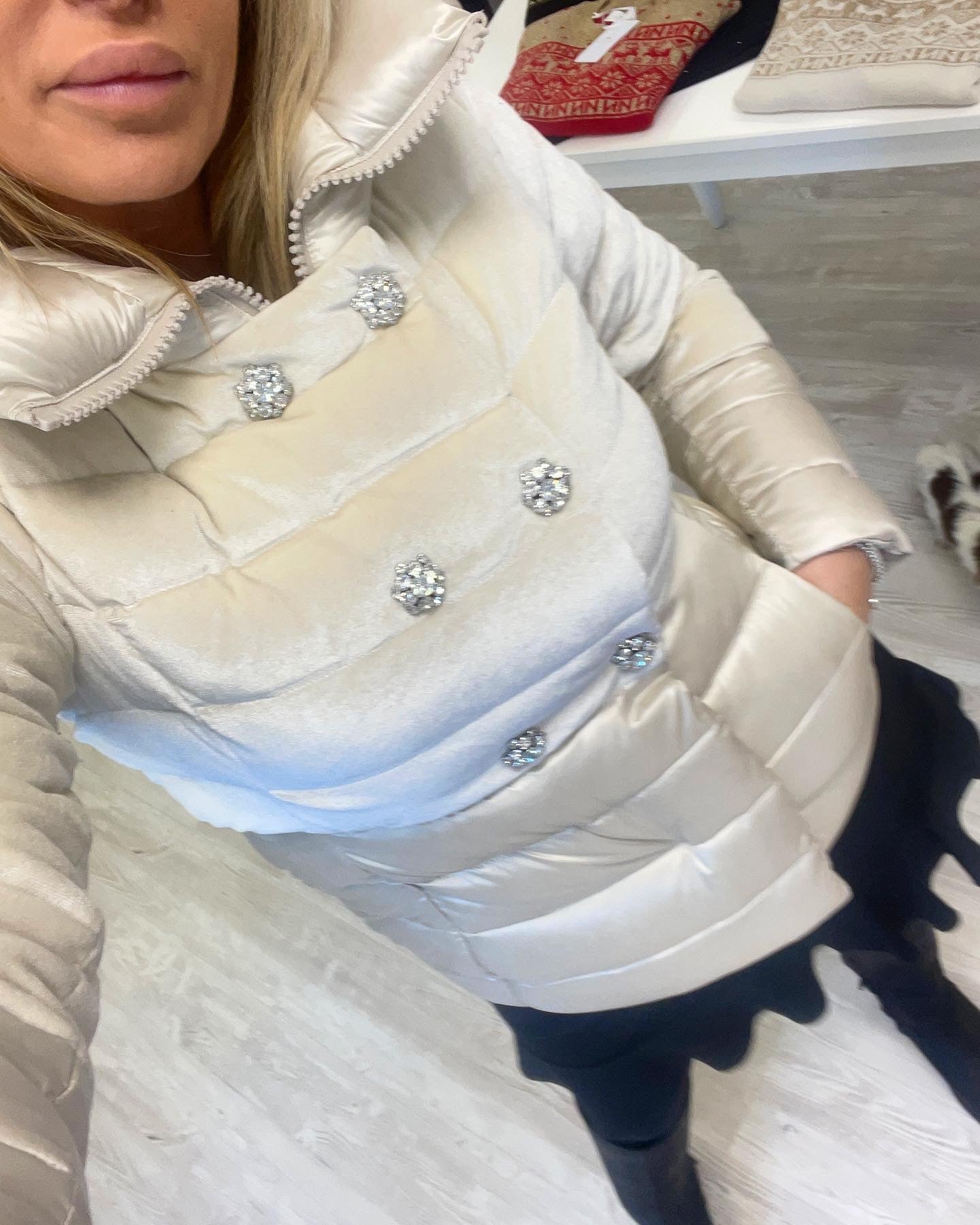 Piumino d’oca doppio petto con bottoni gioiello